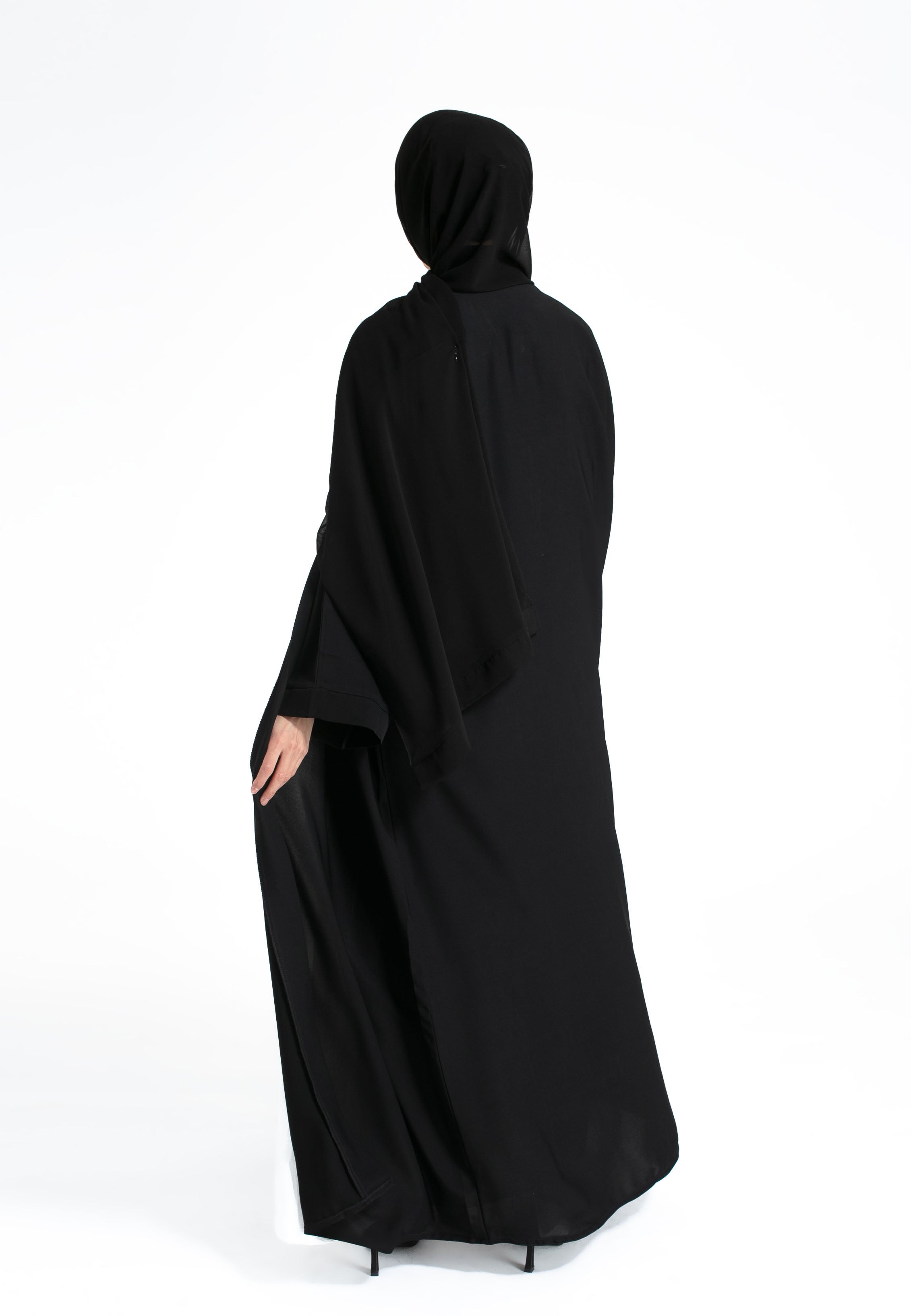 Stay stylish with our plain black open abaya with wide sleeves. Featuring snap buttons on front and crafted from premium Nida, it's perfect for casual wear. Pair effortlessly with our inner slip dresses. Includes matching hijab and belt. Ideal for summer, daily wear and formal wear.