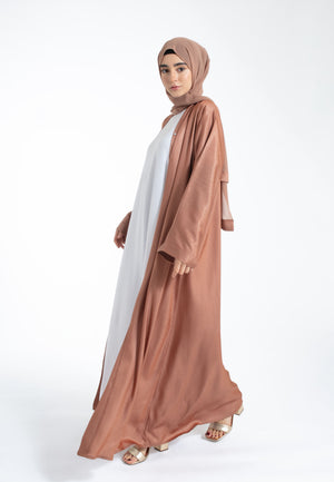 Elevate your wardrobe with the Shimmer Textured Open Abaya in stunning Copper. Crafted from lightweight, breathable polyester, this abaya is perfect for the summer months, Ramadan, Eid, or casual evenings out. Designed with convenient snap buttons on the front, it pairs effortlessly with any of our inner slip dresses. Complete your elegant look with the included matching hijab and belt. Experience timeless sophistication and comfort with this versatile addition to your collection.